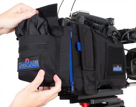 Las fundas camRade camCover están fabricadas a mano con tejido elástico Cordura®, que cuenta con un acolchado de espuma suave en el interior para una protección máxima y una comodidad óptima. Gracias al material suave, resistente al agua y a la abrasión, trabajar con él resulta extremadamente cómodo. Cada funda camCover incluye un estuche inalámbrico para guardar un pequeño receptor de audio u otros accesorios de pequeño tamaño. La funda impermeable integrada se guarda en un bolsillo situado en la parte trasera de la funda, siempre a mano, y está equipada con un cordón y un clip para evitar que se pierda.