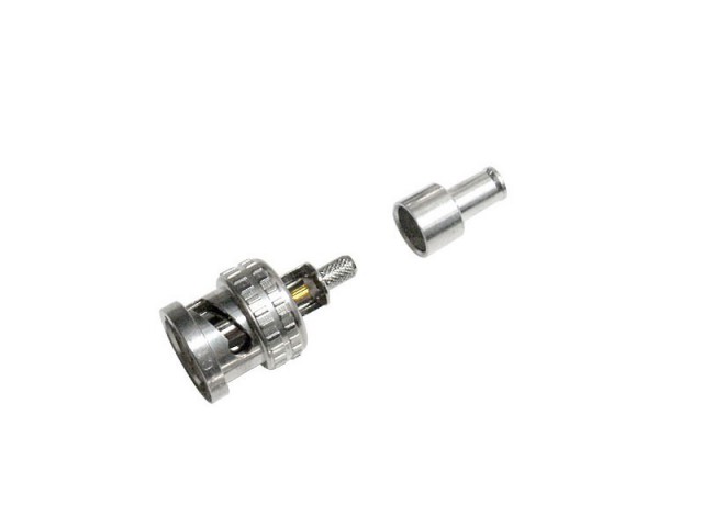 El Canare BCP-C1es un conector BNC (M) de 75 ohmios para crimpado (tipo recto) con un pin central para soldar.