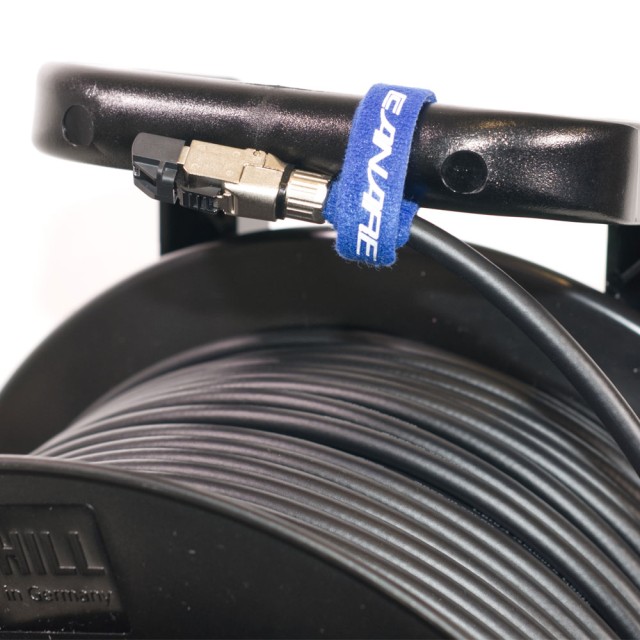 Cable flexible CAT6A STP de 23 AWG con un diámetro exterior de 8,6 mm y conectores Telegartner RJ45, enrollado en un carrete Schill GT 380.RM. Los cables Ethernet se utilizan no solo para redes informáticas, sino también, últimamente, para redes de audio digital, cámaras en red y transmisiones HDBaseT. La longitud total del cable se indica incluyendo los conectores.