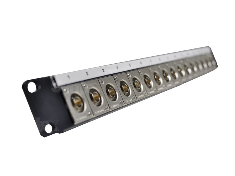 Panel de conexiones Canare BNC de 19" y 1U, equipado con adaptadores BNC (F) / BNC (F) Canare BCJ-JRUDK de doble cara y un soporte para cables en la parte trasera. ¡Gracias a los tornillos métricos suministrados, que se atornillan en los orificios pretaladrados con rosca, se puede manipular fácilmente los conectores sin necesidad de desmontar el panel de conexión del rack!