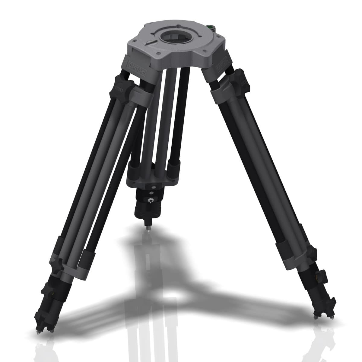 Todos los trípodes Studio están adaptados para montar la gama de accesorios Cartoni, como niveles centrales, soportes de suelo y carros, para poder trabajar en los más diversos entornos. (Para el montaje con soporte de suelo se requieren patas giratorias del trípode)