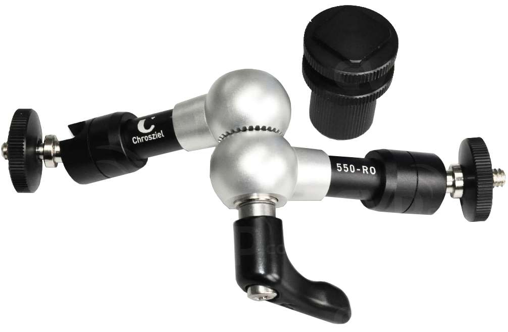 El brazo articulado ROCKY cuenta con una abrazadera central de dos posiciones que permite colocar y fijar el brazo con precisión. Además, está equipado con una rosca de 1/4 de pulgada y un adaptador para abrazadera de frío, por lo que es compatible con diversos dispositivos. Este brazo es capaz de soportar una carga útil de hasta 3 kg, lo que lo convierte en una opción versátil y resistente para diversas configuraciones.