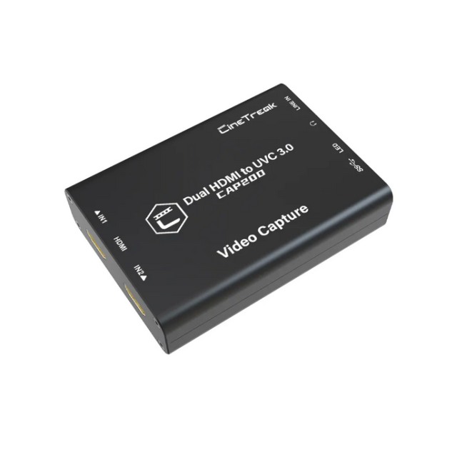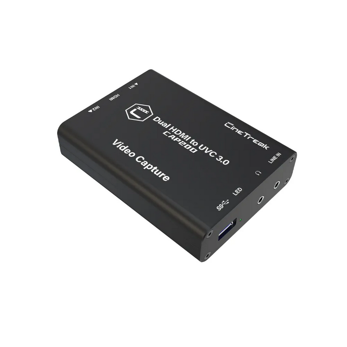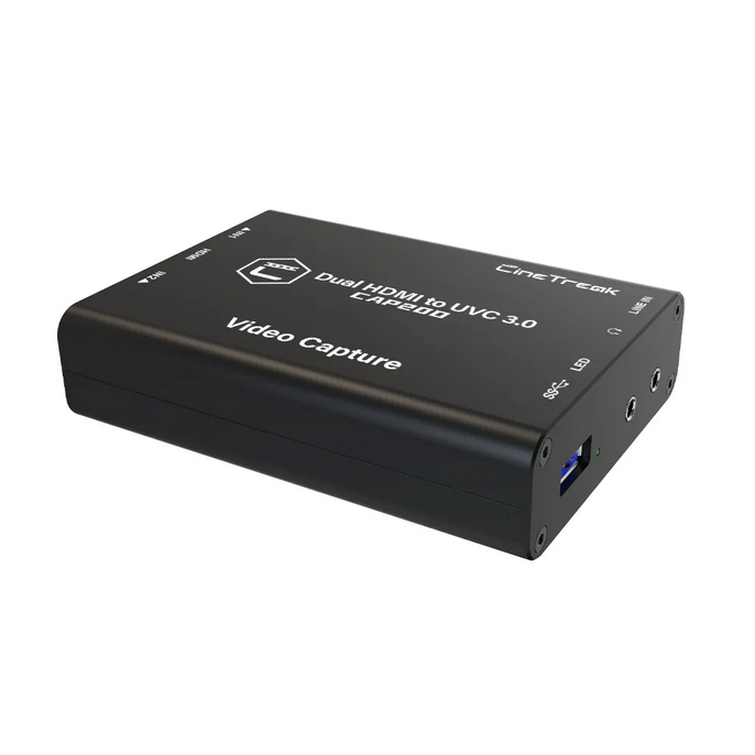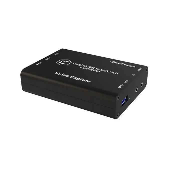 El CineTreak CAP20D mejora tu configuración de transmisión y captura de vídeo gracias a sus dos entradas HDMI, que permiten capturar vídeo sin comprimir a 1080p a 60 fps en tiempo real a través de USB 3.0 o MJPEG a 1080p a 50 fps a través de USB 2.0. Este versátil dispositivo está diseñado para profesionales y ofrece los formatos PIP (imagen en imagen) y PBP (pantalla por pantalla), así como transiciones MIX, CUT y FTB para un cambio fluido al estilo de las emisiones televisivas.