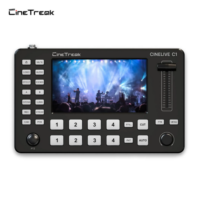 El CineTreak Cinelive C1 es un conmutador de vídeo HDMI compacto de 5,5 pulgadas diseñado para la transmisión profesional, que cuenta con 4 entradas HDMI, croma avanzado, biblioteca multimedia integrada, control PTZ y transmisión en directo RTMP para múltiples plataformas.