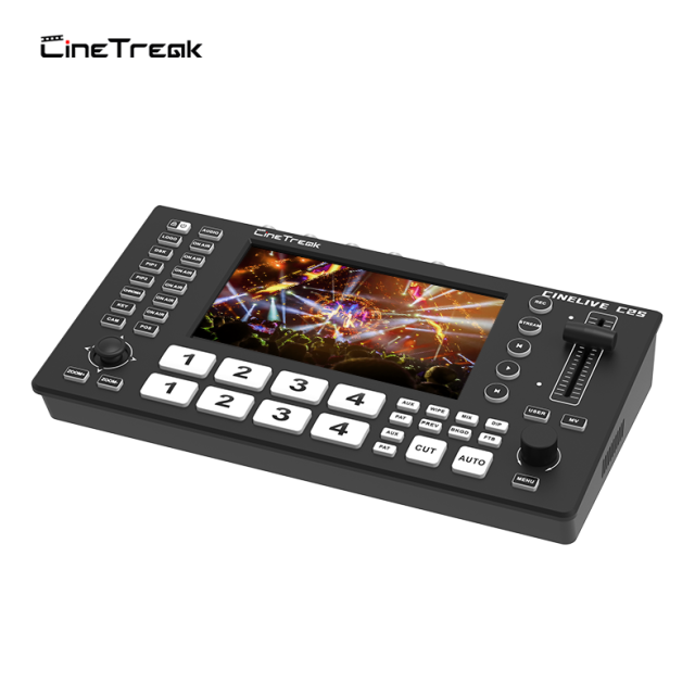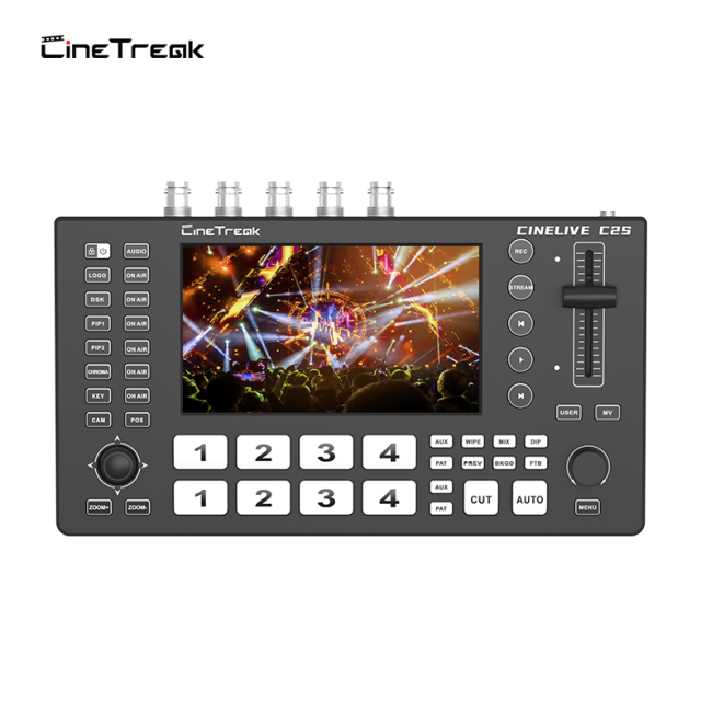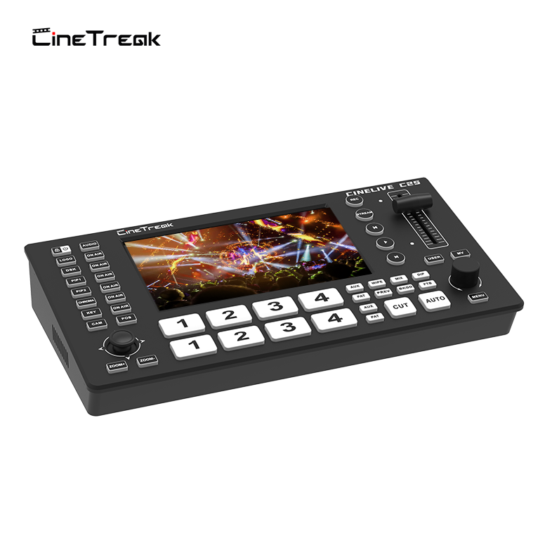 El CineTreak Cinelive C2S es un conmutador de vídeo profesional compacto con una pantalla táctil de 5,5 pulgadas, una entrada híbrida flexible HDMI/SDI, control de cámara PTZ, transmisión dual RTMP y keying avanzado de croma/luma. Está diseñado para retransmisiones en directo y eventos híbridos modernos, y combina rendimiento y portabilidad en una carcasa de aluminio.