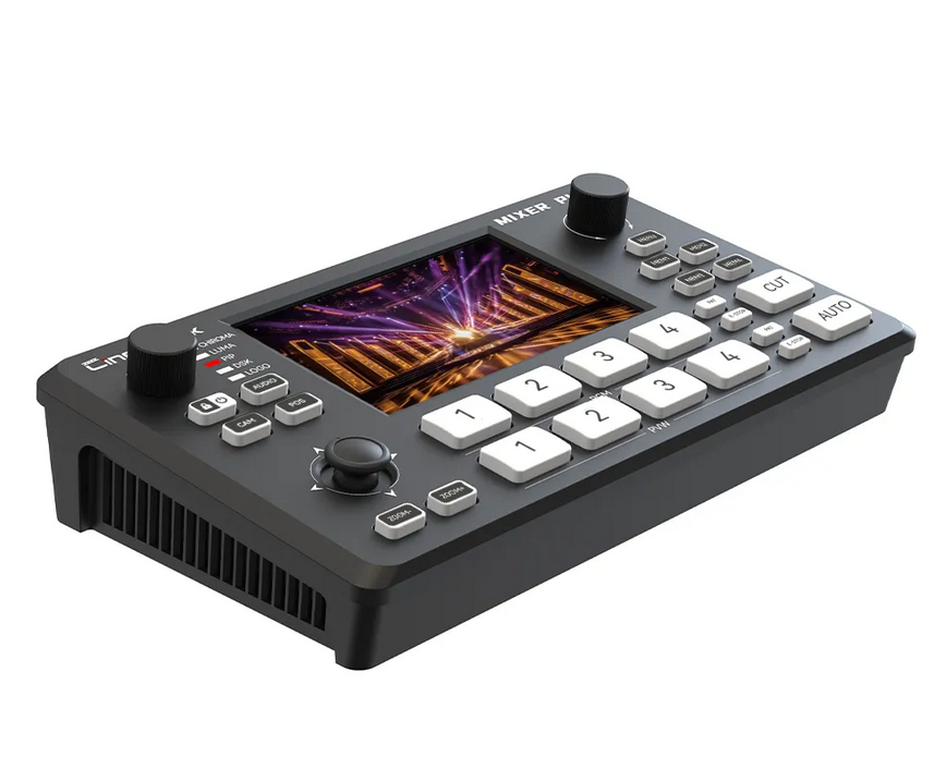 Flexibilidad de múltiples entradas: Mixer Plus es un conmutador de vídeo compacto y totalmente equipado, disponible en versiones con entrada HDMI y SDI, y diseñado para satisfacer las necesidades de entornos de producción en directo profesionales. La versión HDMI cuenta con cuatro puertos de entrada HDMI, mientras que el modelo SDI tiene cuatro entradas SDI, y ambos admiten la conmutación de señales de vídeo de alta calidad. Cada unidad ofrece una salida de programa (PGM) y una salida AUX. La salida AUX admite vistas previas con múltiples pantallas y salidas de señal de vídeo personalizables, lo que ofrece una flexibilidad excepcional en las retransmisiones en directo. Ambas versiones están equipadas con un puerto LAN que se puede utilizar para controlar cámaras PTZ o para conectarse a nuestro software de control oficial en PC, lo que permite un acceso completo a las funciones del dispositivo. Otras funciones de audio incluyen dos entradas de audio de línea y una salida para auriculares para monitorizar el sonido en tiempo real. El puerto USB 2.0 integrado permite importar fácilmente archivos multimedia, como logotipos, fondos e imágenes estáticas, mientras que el puerto USB 3.0 de alta velocidad funciona como interfaz UVC, lo que permite la captura de vídeo HD sin comprimir directamente en OBS y otro software de retransmisión en directo. Tanto si prefieres los flujos de trabajo HDMI como SDI, Mixer Plus ofrece una solución fiable, flexible y fácil de usar para la producción en directo con múltiples cámaras.