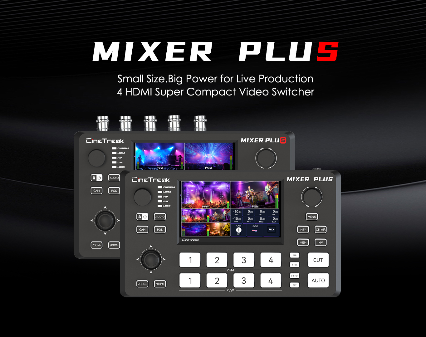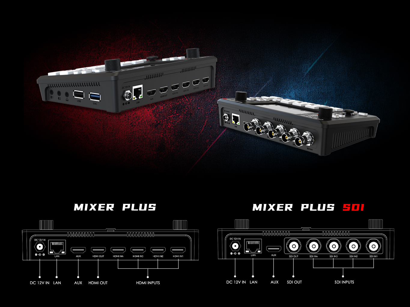 Mixer Plus es un potente y compacto conmutador de vídeo diseñado para retransmisiones en directo, producción de eventos y retransmisiones con múltiples cámaras. Está disponible en dos versiones que se adaptan a diferentes necesidades de flujo de trabajo: Mixer Plus con cuatro entradas HDMI y Mixer Plus SDI, que ofrece cuatro entradas SDI para garantizar la compatibilidad con señales de calidad de emisión. Ambos modelos admiten conmutación fluida entre múltiples canales, salida AUX personalizable y monitorización Multi View en tiempo real. Gracias a hasta 30 efectos de transición integrados, incluidos Mix y DIP, los usuarios pueden crear transiciones de escena profesionales con duración ajustable. La flexibilidad de audio está garantizada por dos entradas de micrófono y un conector para monitorización de auriculares, que permiten controlar el audio en tiempo real. El conmutador también admite el control de cámaras PTZ a través de VISCA sobre IP, lo que permite conectar hasta cuatro cámaras con múltiples preselecciones a un solo dispositivo. Otras herramientas de producción incluyen chroma key, luma key, imagen en imagen (PIP), keying de salida (DSK) y superposición de logotipos. Mixer Plus y Mixer Plus SDI están equipados con una interfaz USB 3.0 UVC para streaming HD sin comprimir y un puerto USB 2.0 para importar archivos multimedia, como logotipos y fondos, y ofrecen una solución de conmutación completa y versátil adaptada a los creadores de contenido profesionales y a los equipos de producción en directo.