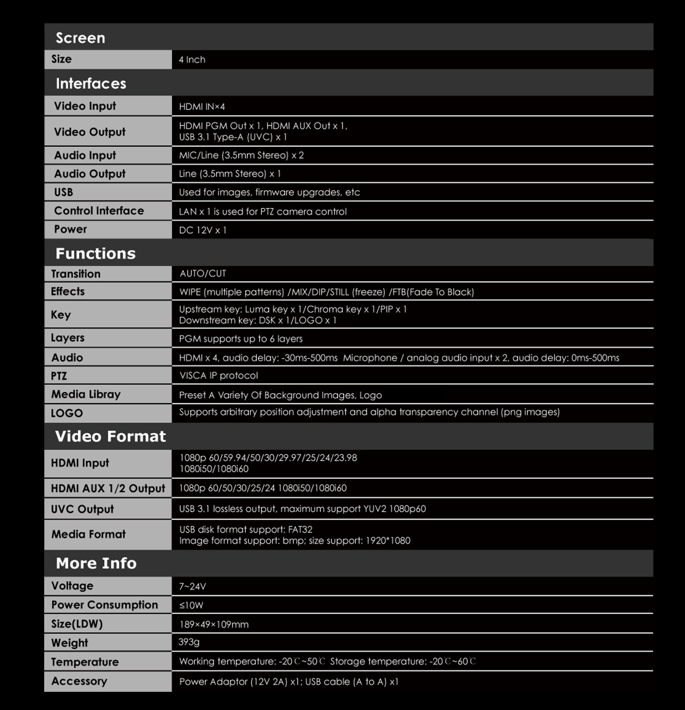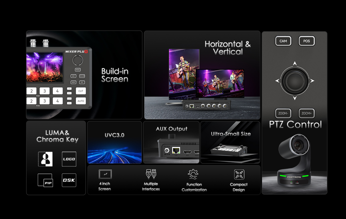 Entrada dual para micrófono, monitorización de audio y efectos de transición integrados: Mixer Plus ofrece dos entradas para micrófono y un conector para monitorización de auriculares, lo que permite una fuente de audio flexible y monitorización de audio en tiempo real. También admite hasta 30 efectos de transición integrados, incluidos Mix y DIP, con duración de transición personalizable.
