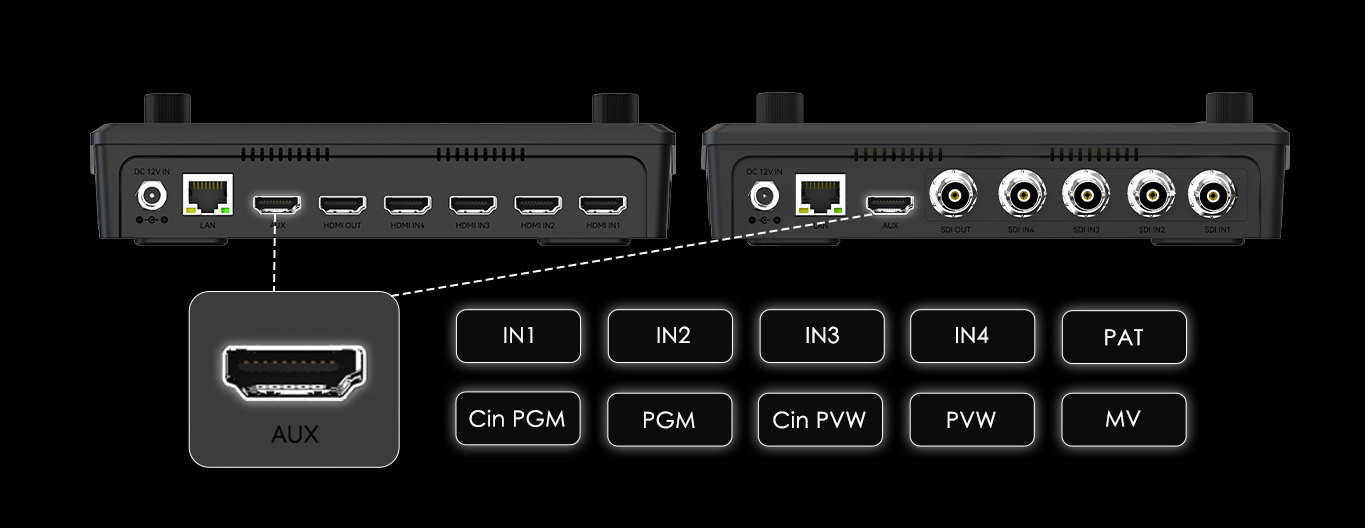 Salida AUX HDMI personalizable: Mixer Plus está equipado con una salida AUX HDMI universal que permite a los usuarios personalizar la señal de salida entre varias opciones, incluyendo IN1, IN2, IN3, IN4, PGM, Clean PGM, PVW, Clean PVW, PAT y Multi View, ofreciendo así la máxima flexibilidad para diversas necesidades de producción.