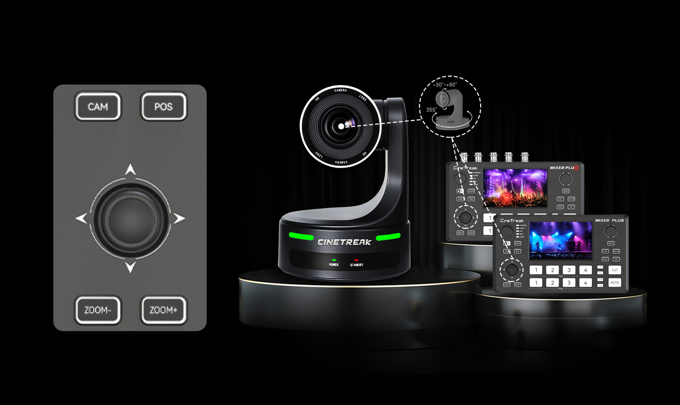 Control de cámaras PTZ a través de VISCA over IP: Mixer Plus admite el control profesional de cámaras PTZ a través del protocolo VISCA-over-IP, lo que permite controlar hasta cuatro cámaras PTZ. Cada cámara admite hasta cuatro posiciones preestablecidas, lo que permite cambiar de escena de forma rápida y eficaz durante la producción.