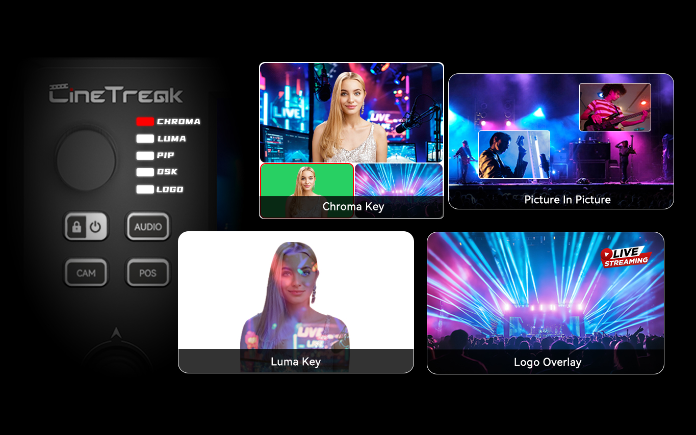 CHROMA: Permite el chroma keying, lo que le permite eliminar fondos monocromáticos verdes o azules y sustituirlos por otra imagen o fuente de vídeo, ideal para escenas virtuales o entrevistas a distancia.