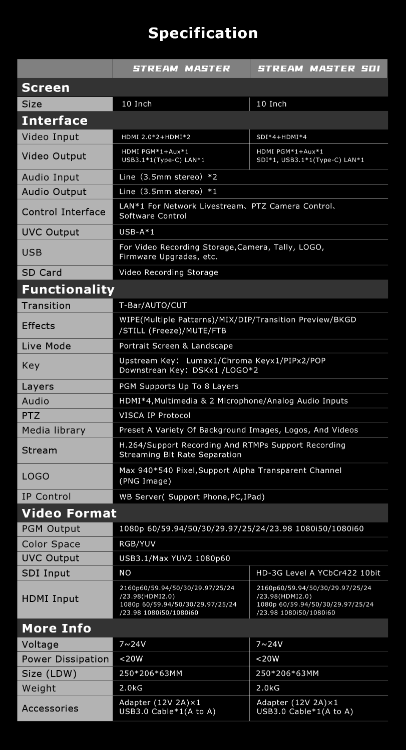 Gracias al control de cámaras PTZ (hasta 4 cámaras a través de VISCA), el funcionamiento IP inalámbrico y la transmisión dual RTMP, Stream Master ofrece una flexibilidad total. Sus herramientas de croma y keying de luminancia permiten crear un entorno de estudio virtual de primera clase, mientras que las superposiciones PIP/POP permiten diseños personalizados con múltiples cámaras.