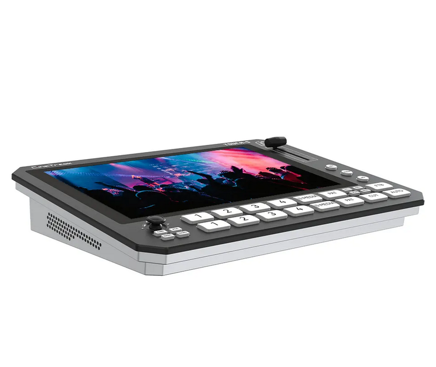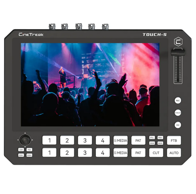 El CINETREAK Touch-S es un mezclador de vídeo táctil profesional y versátil diseñado para retransmisiones en directo, producciones multicámara y retransmisiones sobre la marcha.Cuenta con una pantalla táctil de 10 pulgadas para un control intuitivo, integrada en una elegante y compacta carcasa de aluminio. Gracias a la compatibilidad con 6 entradas (4 HDMI o 4 SDI, más AUX y fondo), salidas PGM/PVW independientes y mezcla automática de entradas, el Touch-S gestiona con facilidad las conmutaciones complejas. Ofrece grabación H.264 con reproducción instantánea, transmisión dual RTMP y control integrado de cámaras PTZ (hasta 4 cámaras a través de VISCA). El control IP inalámbrico a través de PC, teléfono o tableta permite el control remoto, mientras que potentes funciones como las disposiciones personalizables PIP/POP, el chroma y el luma keying, los modos vertical/horizontal y la compatibilidad opcional con NDI|HX lo convierten en una solución de producción flexible y completa para creadores, productores y profesionales del sector audiovisual.