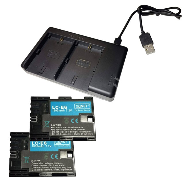 2 unidades de batería CONST LC-E6 (LP-E6), de 7,2 V y 1800 mAh, y un cargador de dos canales CONST C-2E6