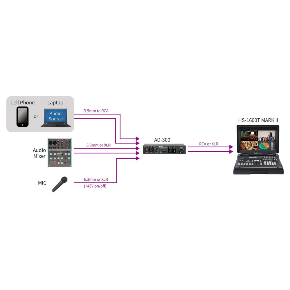 La unidad profesional de retardo y efectos Datavideo AD-300 ofrece una amplia gama de funciones integradas para el procesamiento de sonido y la sincronización de audio y vídeo en producciones en directo. El dispositivo está equipado con cinco entradas (3 balanceadas, 2 no balanceadas) y es capaz de aplicar retardo de audio (hasta 3 s), mezcla, ecualización y filtros de paso alto y paso bajo; el retardo se puede ajustar de forma independiente para cada una de las entradas. El ecualizador ofrece ocho bandas de frecuencia (125 Hz – 16 kHz) con un rango de ± 10 dB. El panel frontal cuenta con una pantalla LCD de 2" para ajustar fácilmente los parámetros de las funciones, como la relación de compresión en los efectos dinámicos (hasta 100:1). El AD-300 también realiza la conversión de audio balanceado/no balanceado y permite cambiar el nivel entre línea y micrófono, incluyendo soporte para alimentación fantasma de +48 V en las entradas XLR.
