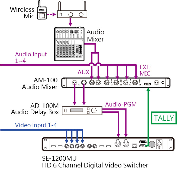 • Mezclador de audio de 6 canales (4 entradas mono + 1 entrada estéreo)