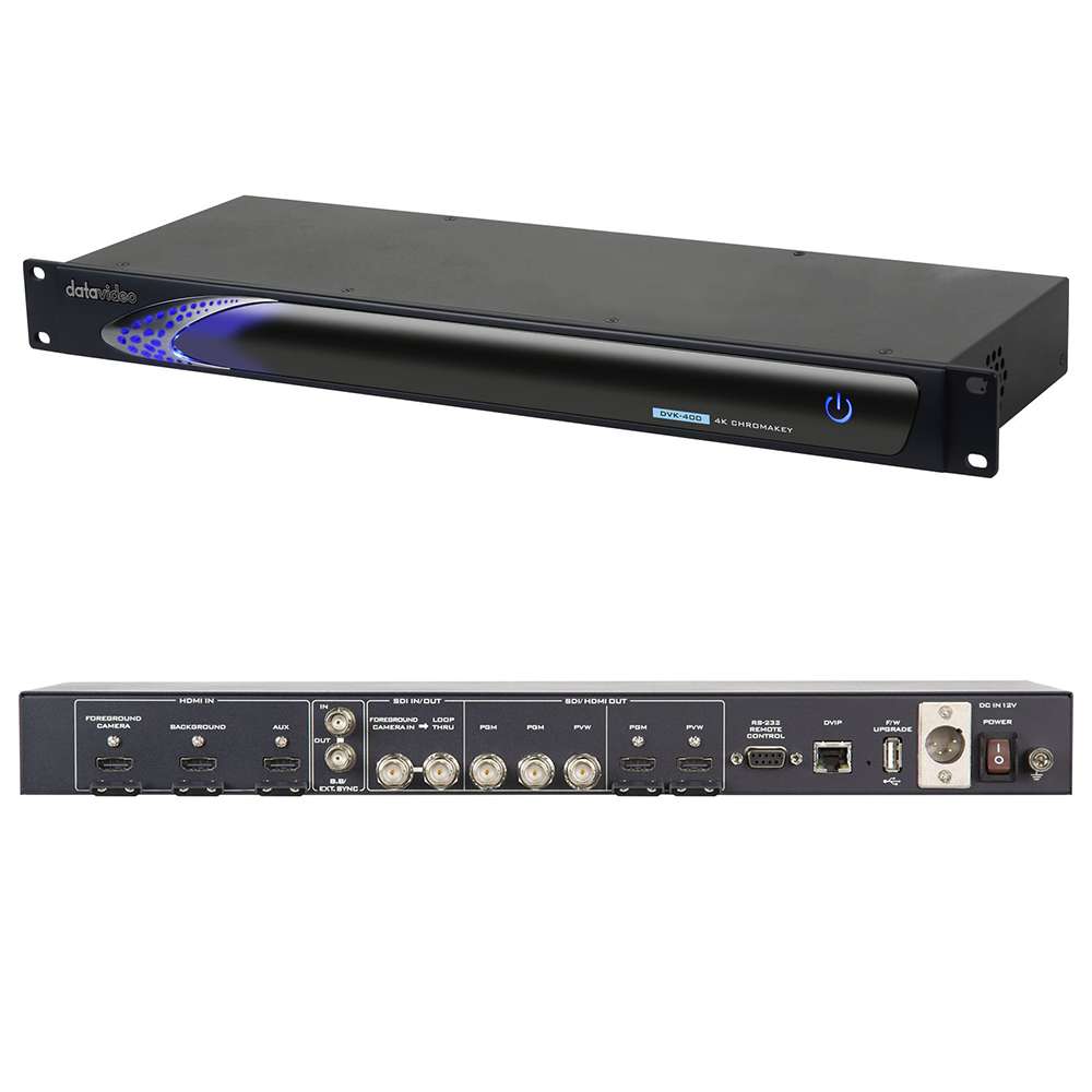 Permite la composición de primer plano sobre fondo a través de vídeo en directo y admite entradas SDI y HDMI para el primer plano y el fondo, así como salidas SDI y HDMI para la vista previa y la salida del programa. La entrada HDMI independiente permite superponer texto, gráficos y vídeo. Los sofisticados algoritmos del croma ayudan a mantener la transparencia del humo y proporcionan cromas nítidos con cabellos claros, botellas llenas de agua u objetos de cristal. El DVK-400 mide 44,55 mm de altura y cuenta con orejas de montaje en rack integradas.