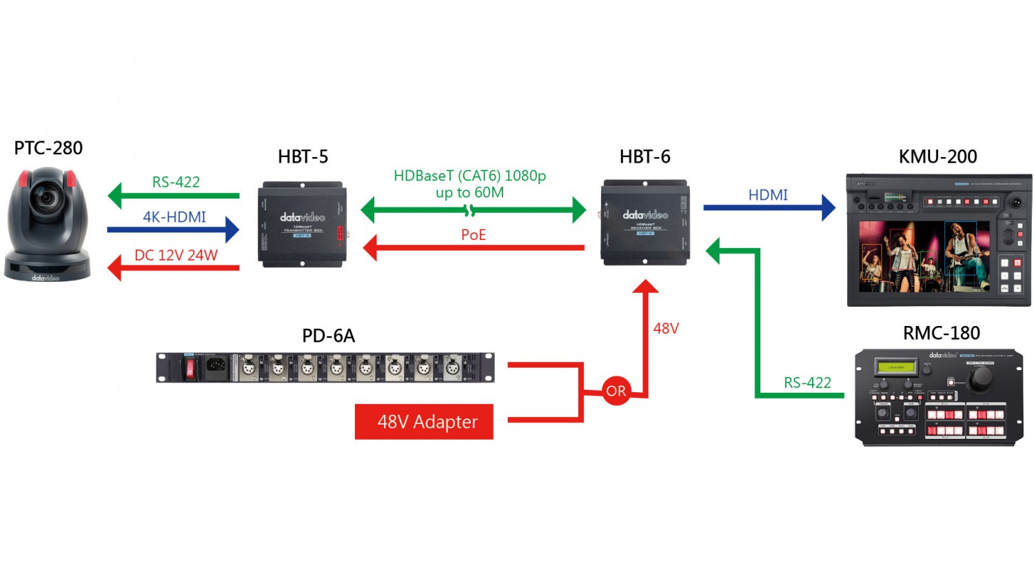 Receptor para la interfaz HDBaseT que permite transmitir la señal HDMI a una distancia de hasta 60 m en resolución 1080p o de 35 m en 4K@30 mediante un cable Cat 6. Es compatible con HDMI Deep Colour y Full 3D, resoluciones de hasta 4K/2K a 30 fps, HDCP 2.2/1.4, DTS-HD Master Audio y Dolby TrueHD, entre otros. Incluye compatibilidad con alimentación Power-over-Ethernet (PoE) y comandos RS-232/RS-422. Se suministra con una fuente de alimentación de 48 V.