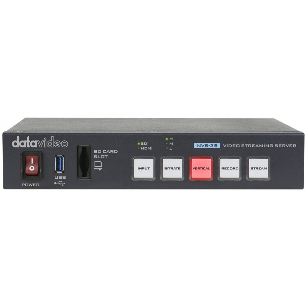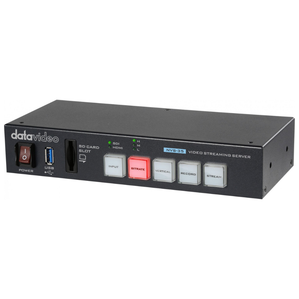 El servidor de streaming Datavideo NVS-35 combina funciones para la transmisión y grabación simultáneas de vídeo H.264, con entradas de vídeo SDI y HDMI, así como entradas de audio RCA y (ahora) XLR balanceadas. Permite transmitir a dos plataformas al mismo tiempo; otra novedad es la compatibilidad con la transmisión de vídeo vertical 9:16 y el protocolo SRT.