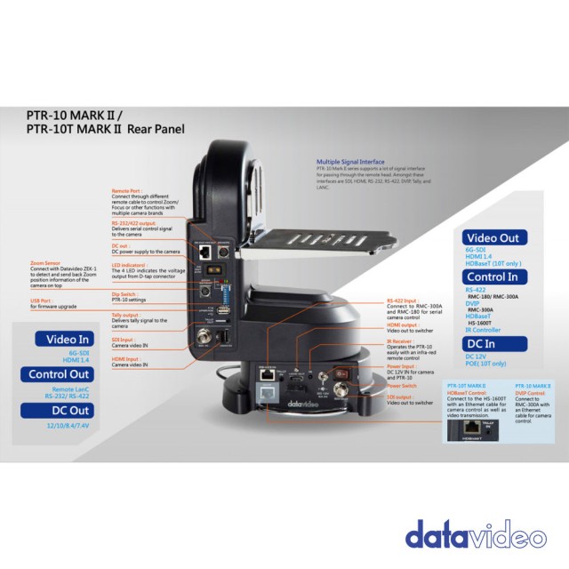 El PTR-10 MARK II es compatible con numerosas interfaces de señal para el paso a través del cabezal remoto. Entre estas interfaces se incluyen SDI, HDMI, RS-232, RS-422, DVIP, Tally y LANC.