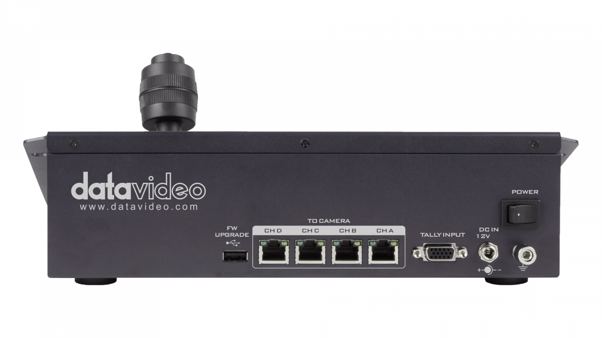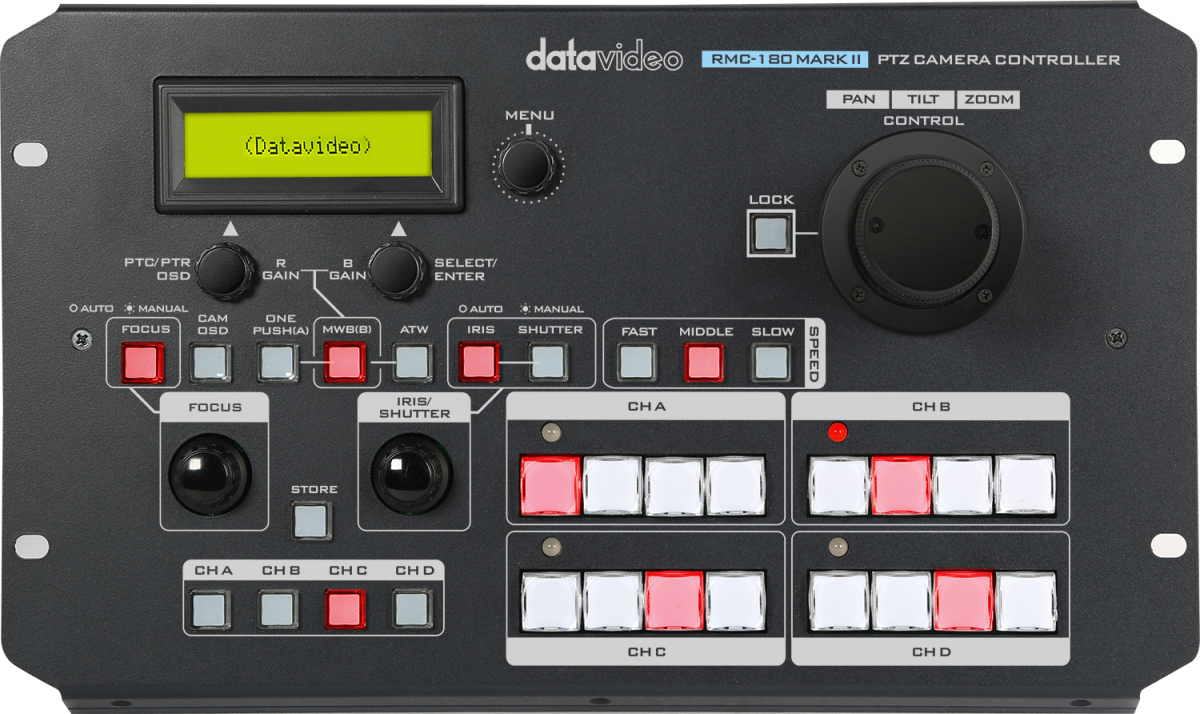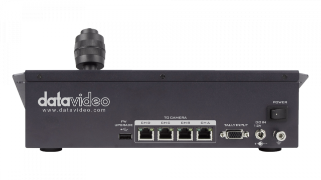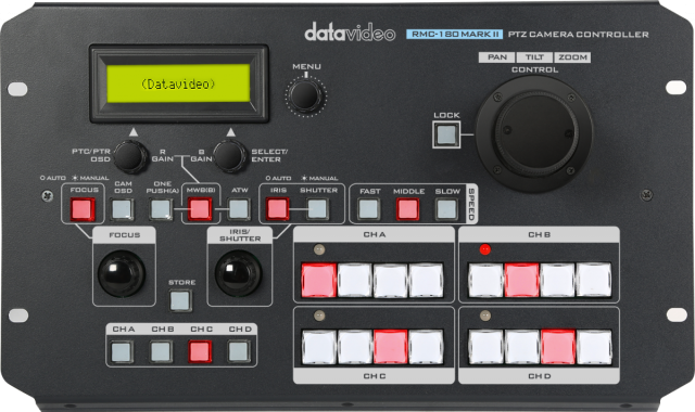 El RMC-180 MARK II es un controlador de cámaras que permite controlar hasta 4 cámaras PTZ, cámaras de bloque o cabezales giratorios robóticos compatibles de Datavideo a través de una interfaz RS-422.