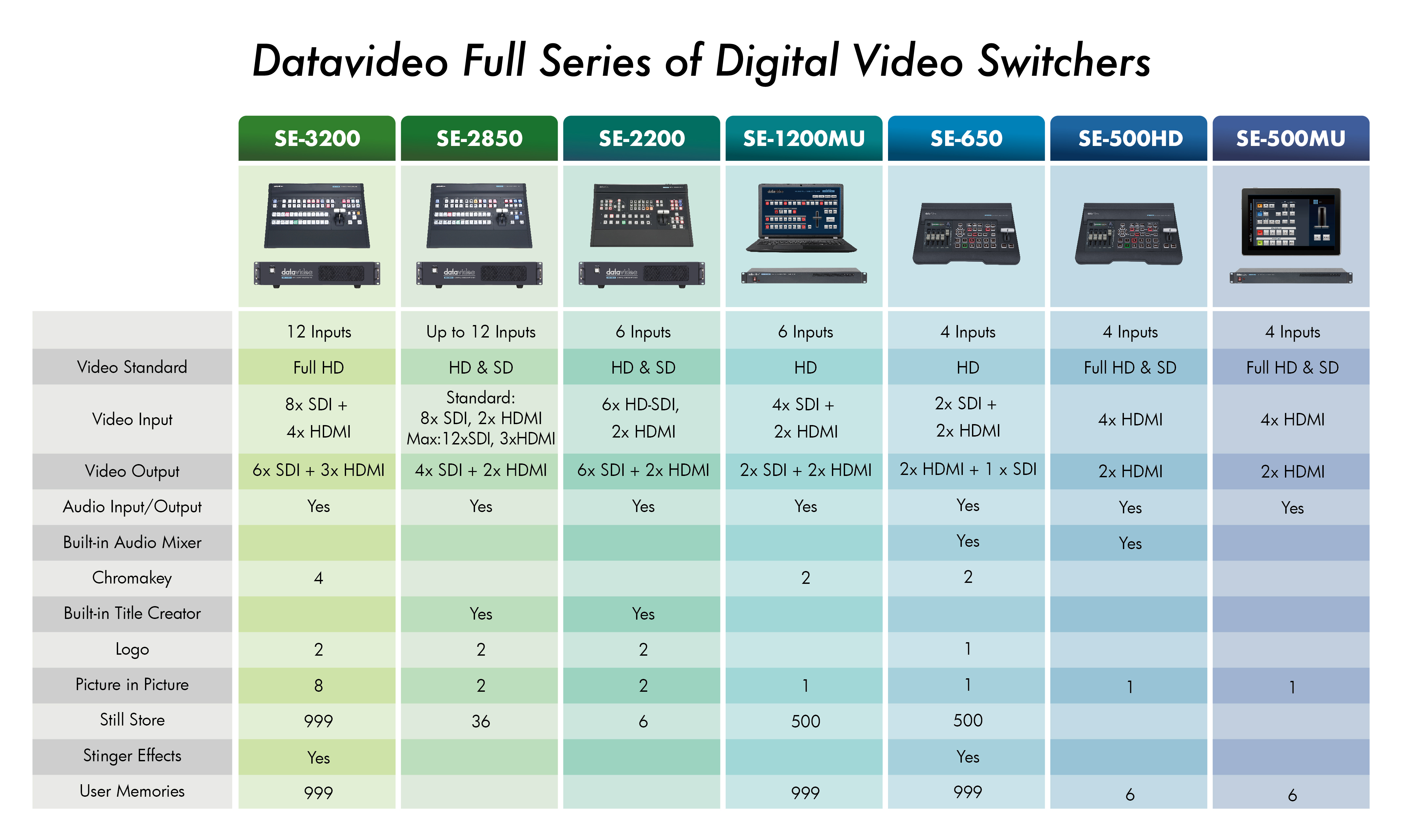 La compacta mesa de regiduría HD de cuatro canales SE-650 ofrece entradas y salidas HD-SDI y HDMI con compatibilidad con formatos de hasta 1080i, así como una sección de mezcla de audio con entradas de micrófono y asimétricas (RCA). Por supuesto, tampoco faltan numerosas funciones para la gestión de programas HD, incluyendo claves de crominancia/luminancia, funciones de imagen en imagen y multivisión, generador de barridos, memoria para imágenes fijas o soporte para señalización (tally). ¡La unidad de control SE-650 es la herramienta ideal para producciones de vídeo más pequeñas que combinan cámaras profesionales y tecnología HDMI!