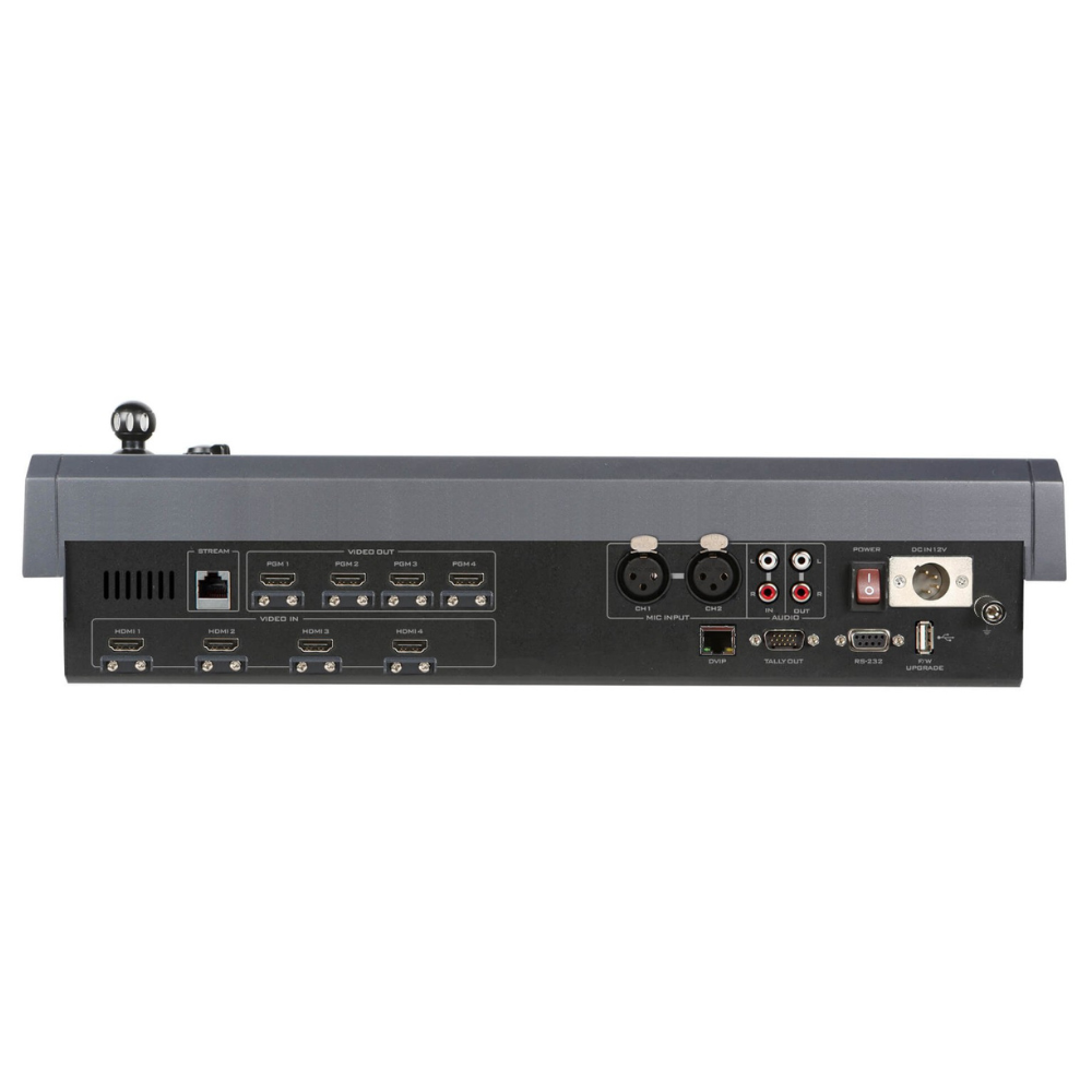 La función integrada de control remoto de cámaras permite controlar simultáneamente hasta tres cámaras PTZ, incluyendo la creación de presets (zoom, posición, etc.), el ajuste del balance de blancos, la apertura del diafragma, etc. Se pueden guardar hasta 4 presets para cada una de las cámaras, lo que da un total de 12 posiciones de cámara predefinidas. La unidad de control admite la transmisión y la grabación simultáneas de programas: se puede transmitir a hasta dos plataformas a la vez (o 25 en caso de suscripción opcional al servicio dvCloud), incluyendo servicios como Facebook, YouTube y Twitch; una característica adicional es, por ejemplo, el modo vertical para ver programas en dispositivos móviles.