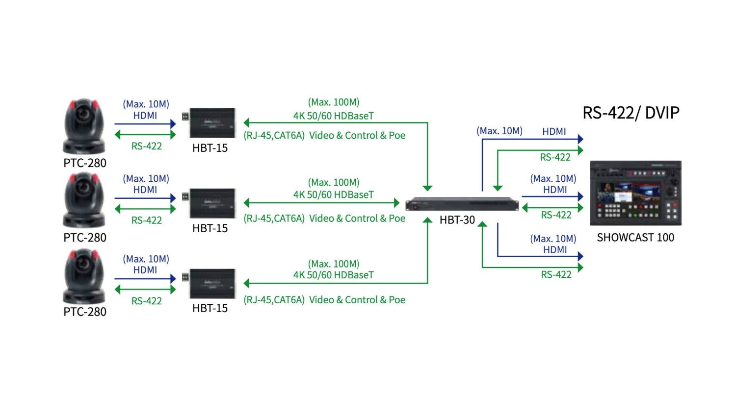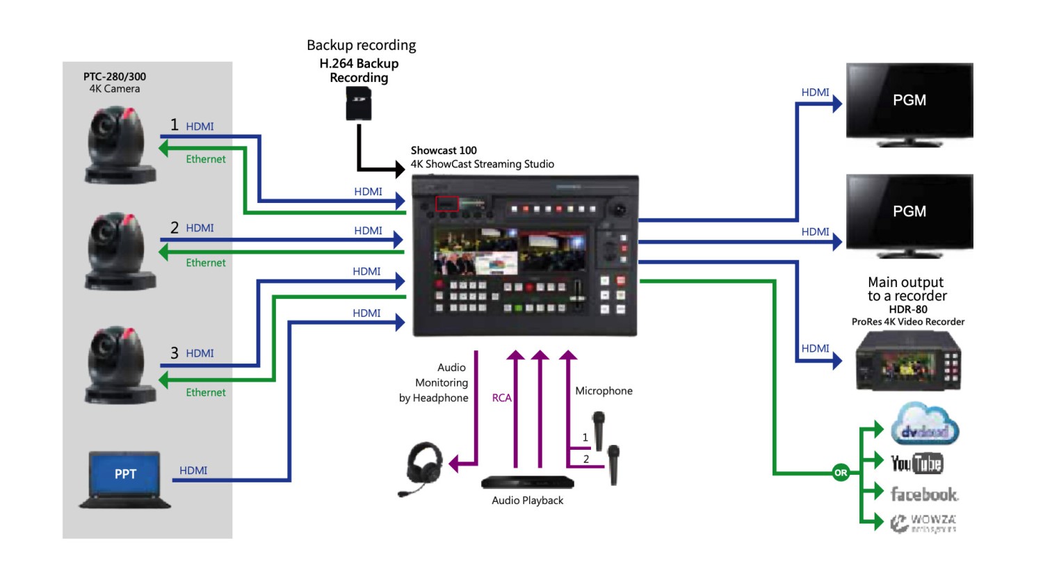 El codificador dual de transmisión en directo integrado permite grabar y transmitir simultáneamente. Gracias a la función de grabación de la cámara ShowCast 100, puede hacer copias de seguridad de los archivos de vídeo grabados de forma fácil y sin esfuerzo para su edición en posproducción. Dependiendo del ancho de banda, puede configurar una tasa de bits baja, media o alta. Para satisfacer la creciente demanda de visualización en dispositivos móviles, ahora se puede activar fácilmente la visualización en modo vertical en el dispositivo ShowCast 100 con solo pulsar el botón Vertical, de modo que los espectadores podrán ver el programa en sus dispositivos móviles manteniéndolos en posición vertical, sin necesidad de cambiar la orientación. Al mismo tiempo, puede transmitir a dos plataformas de retransmisión en directo, como Facebook, YouTube y Twitch. Con el servicio opcional Datavideo dvCloud, puede transmitir a 25 plataformas de retransmisión en directo simultáneamente y realizar copias de seguridad automáticas de los archivos de vídeo en un servidor en la nube.