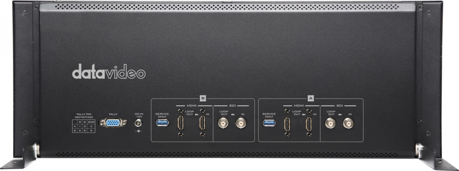 El Datavideo TLM-102, que cuenta con dos pantallas HD de 10,1 pulgadas en un único chasis de 4 RU, sirve tanto para la visualización de vídeo como para el control de la calidad de la señal mediante las funciones integradas de vectoscopio y monitor de forma de onda. Cada uno de los monitores dispone de una entrada SDI y una HDMI, así como de la misma configuración de salidas. Gracias a las funciones de conversión de señal, se puede utilizar una de las entradas para la monitorización y la otra para la conversión. Con un chasis de cuatro unidades de rack, el monitor se puede integrar fácilmente, por ejemplo, en unidades móviles de retransmisión, etc. Es un complemento ideal para salas de control pequeñas, como Datavideo SE-650, SE-700, Blackmagic Design ATEM Television Studio HD y muchas otras.