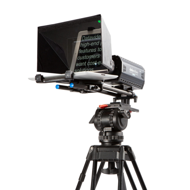 El Datavideo TP-500 es un teleprompter universal para cámaras réflex digitales. Para visualizar el contenido se puede utilizar una tableta de 7" (no incluida). Es ideal para distancias cortas (aproximadamente 2-4 m); para controlarlo, se puede utilizar un mando a distancia con cable o un mando a distancia Bluetooth. El mando a distancia no está incluido.