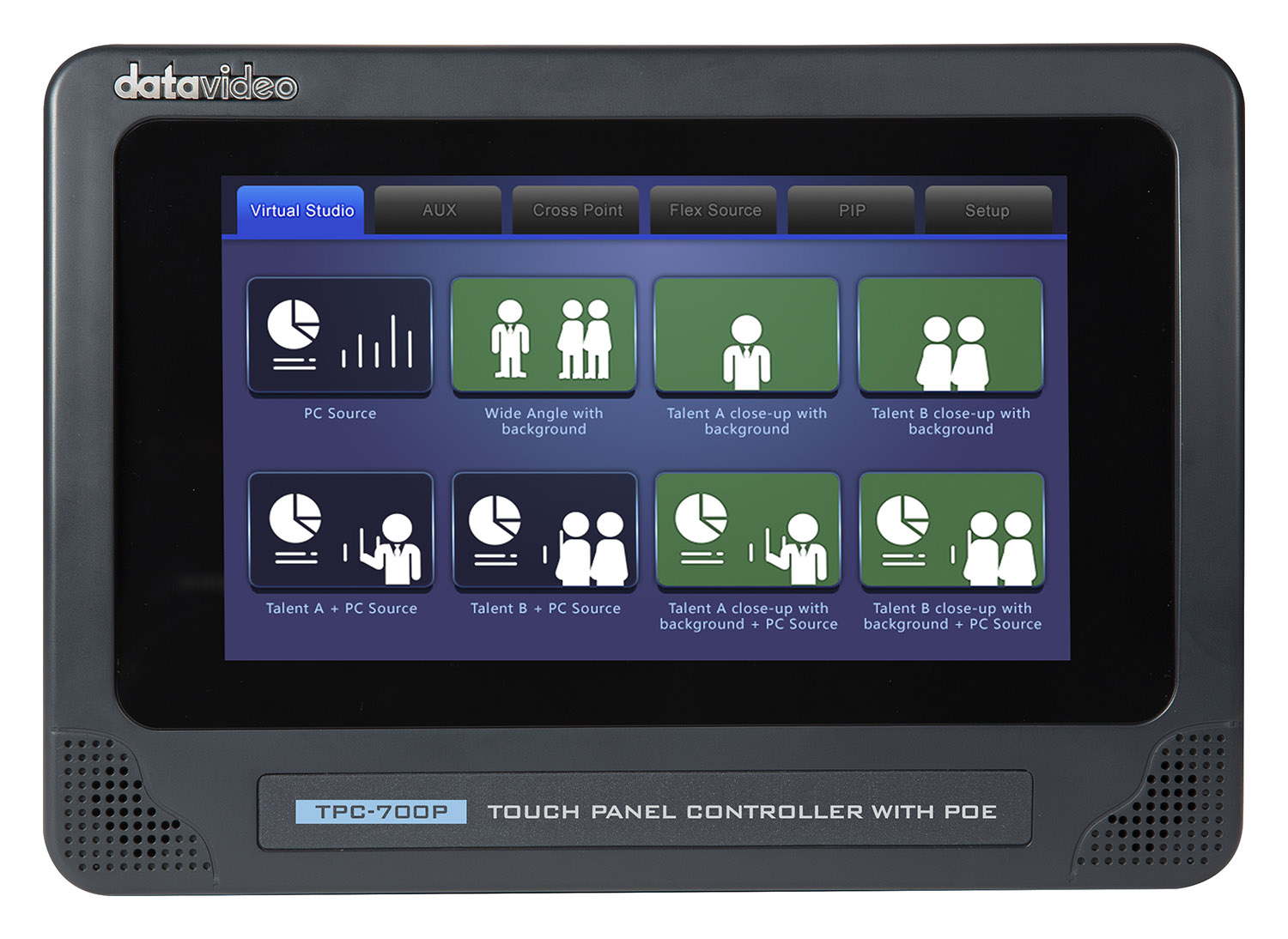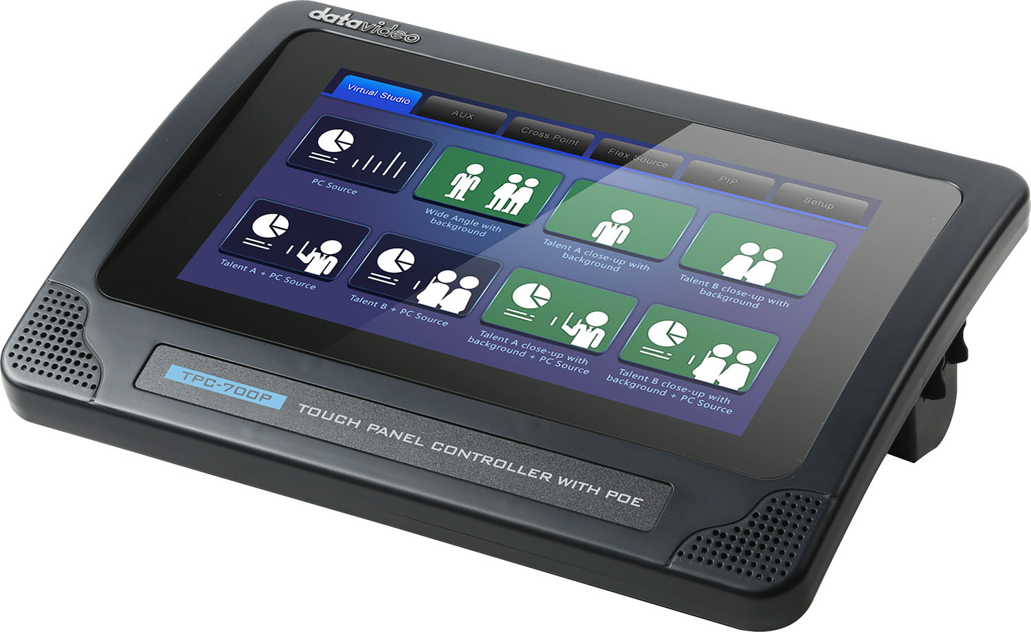 Panel de control con pantalla táctil de 7" y compatibilidad con PoE. Se trata de la solución ideal para las consolas de la serie Datavideo 3200 y el sistema de presentaciones VGB-2000, en combinación con la solución de keying DVK-400 (compatible con las funciones Lumakey, Blur Background y Aux Layer Swap). Gracias a la compatibilidad con PoE, el panel se conecta con un solo cable (alimentación y datos); su diseño muy compacto (220 x 152 x 79 mm, 0,85 kg) facilita aún más la instalación. Por supuesto, los botones son totalmente configurables.