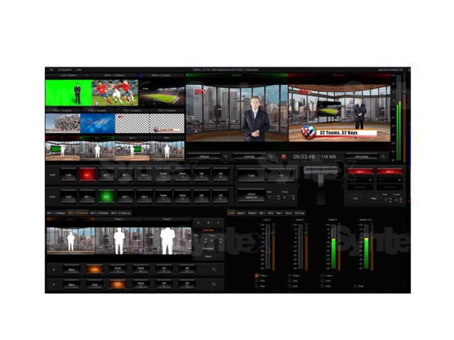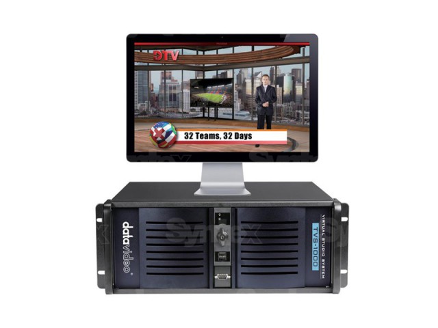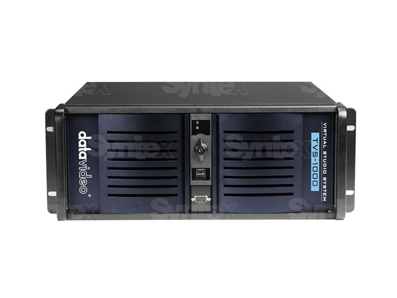 El TVS-1000 es un sistema completo de estudio virtual. Admite hasta 6 capas, incluyendo mapas UV para insertar el equipamiento virtual del estudio, la posibilidad de aplicar un fondo personalizado y otras funciones para configurar el aspecto del estudio virtual. El hardware está equipado con una grabadora de disco y un sistema de transmisión de vídeo, por ejemplo, al servidor livestream.com.