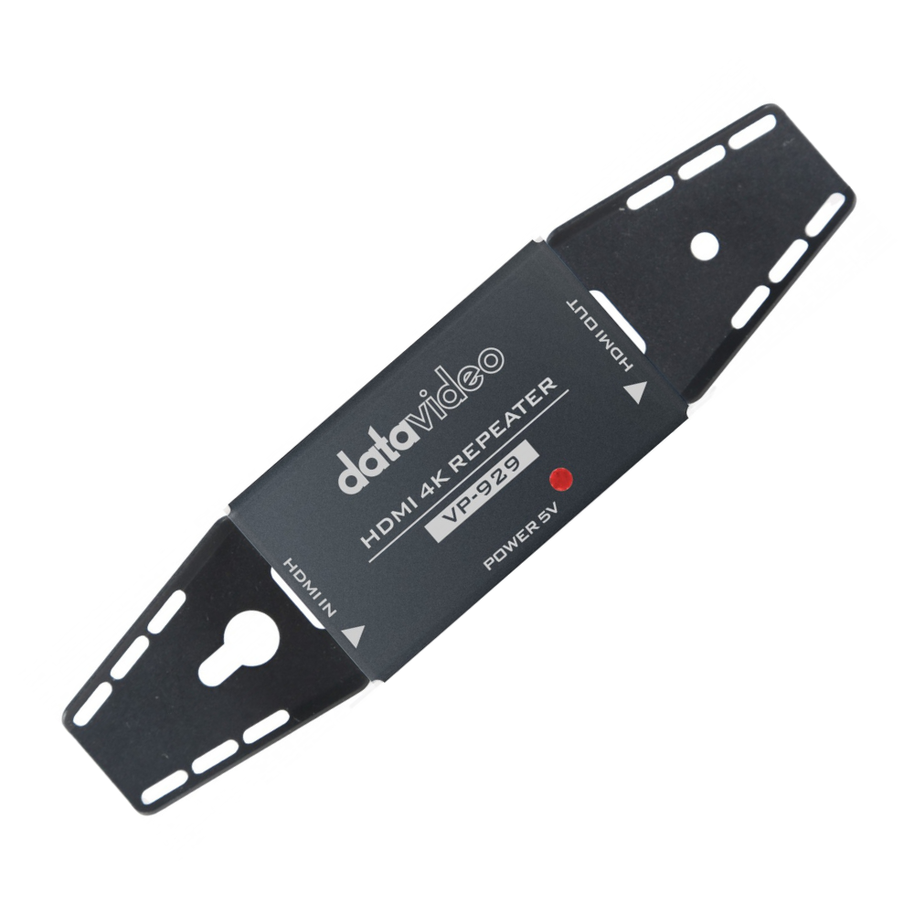 El repetidor HDMI 4K Datavideo VP-929 es capaz de ampliar el alcance del cableado HDMI hasta 10 m (en el caso de una señal 4K) o hasta 15 m (HD), y se puede conectar en cadena (hasta 3 veces) para alcanzar un alcance máximo de 60 m en el caso de una señal HD. Se puede alimentar directamente desde HDMI (solo el primer repetidor) o desde fuentes de 5 V/USB si se conectan varias unidades en cadena. Es un complemento ideal especialmente para instalaciones fijas (techos, paredes...), a lo que contribuyen también los pasacables para fijar los cables HDMI mediante bridas.