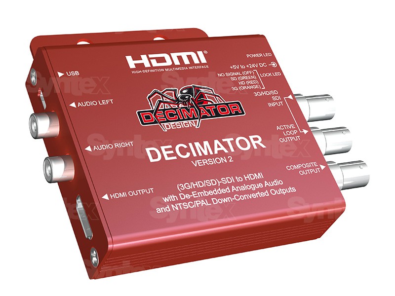 Las funciones del dispositivo DECIMATOR 2 de Decimator Design se han mejorado mediante una nueva actualización de firmware USB y ahora escala simultáneamente (3G/HD/SD)-SDI a HDMI y NTSC/PAL con audio analógico desincrustado (a través de 2 conectores RCA).