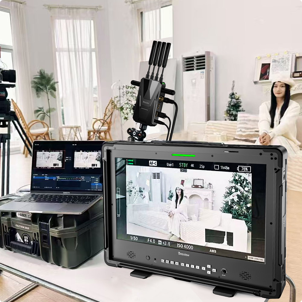 Colaboración entre varias personas, El Atlas X admite la colaboración en múltiples pantallas en una proporción de 1:4. Puede conectar y gestionar cuatro terminales de visualización simultáneamente y proporcionar imágenes 4K Ultra-HD sin pérdidas con monitorización en tiempo real. Esto permite el rodaje con múltiples cámaras y la coordinación en el plató al mismo tiempo, lo que aumenta significativamente la colaboración del equipo y la eficiencia del trabajo. |