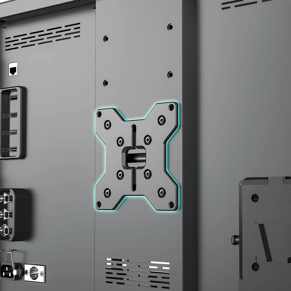 El D21 Pro está diseñado para entornos exigentes y cuenta con una carcasa compuesta resistente a la presión que soporta cargas de hasta 80 kg, además de estar reforzado con protectores de esquinas a prueba de golpes de grado militar, probados para caídas desde una altura de 1,5 metros. Los múltiples puntos de montaje de 1/4"-20 y 3/8" y la compatibilidad con soportes VESA permiten una integración fluida con trípodes de iluminación, carros y equipos de estudio. La flexibilidad de alimentación está garantizada por la conexión a la red eléctrica, la entrada XLR DC o la compatibilidad con baterías V-mount, lo que lo hace ideal para grabaciones en estudio, al aire libre o móviles. El indicador luminoso de tres colores (rojo/verde/azul) situado en la parte frontal aumenta aún más su idoneidad para la producción en directo y los entornos de emisión.