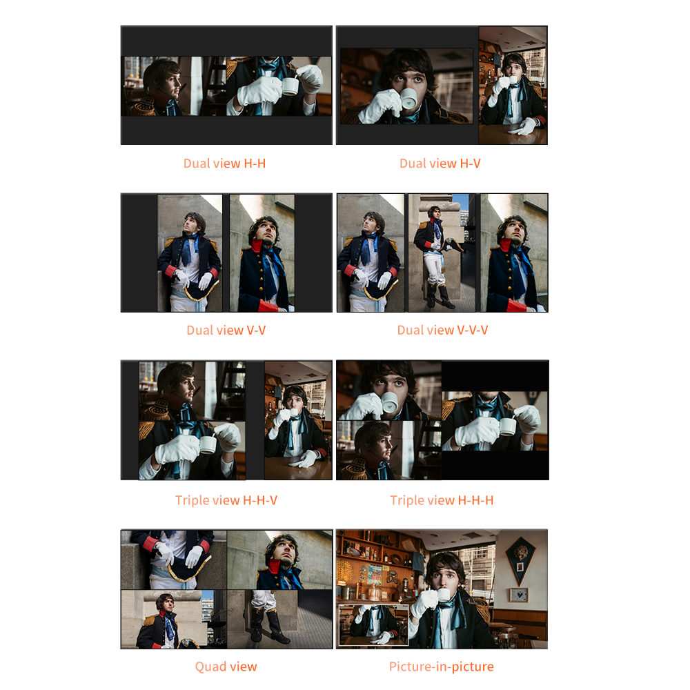Monitorización horizontal y vertical Modo de monitorización de múltiples pantallas Como pionera de las pantallas verticales en el sector, Desview ha equipado los modelos OL14/OL16 con ocho modos de visualización (imagen dividida simple, doble, triple y cuádruple), admite el cambio libre entre horizontal y vertical, sustituyendo así varios monitores tradicionales por un único dispositivo, ideal para dramas cortos verticales, vídeos cortos y retransmisiones en directo. |