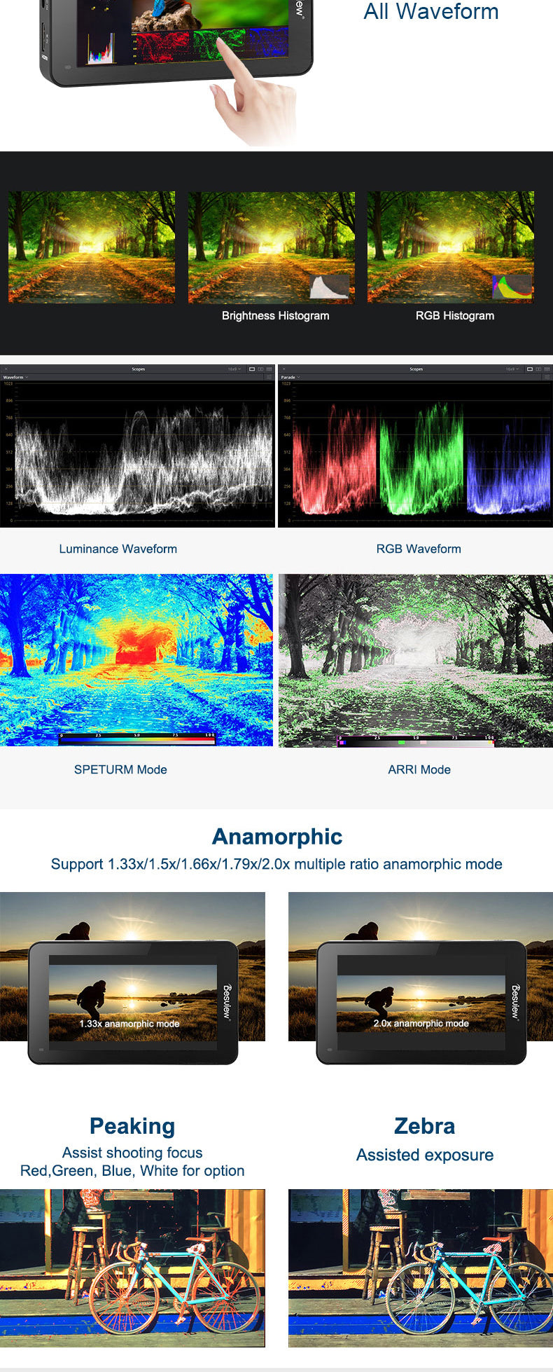 Vectorscopio, All Wave, Color único, Peaking y Área segura, que facilitan la exposición, el enfoque y la composición.