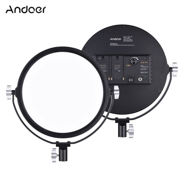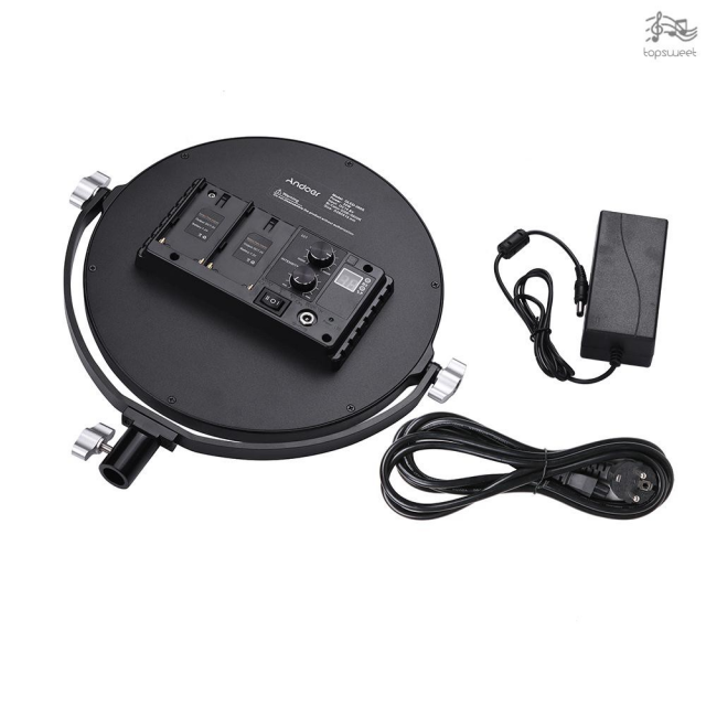 Foco circular portátil para estudio, con la posibilidad de alimentarlo mediante baterías NP-F o una fuente de alimentación de red.