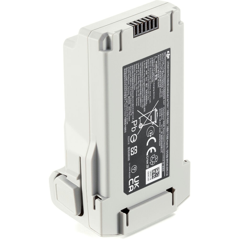 La recarga se puede realizar mediante un cargador USB-C de 30 W opcional. Si se utiliza un concentrador de carga bidireccional, la recarga completa tarda aproximadamente 58 minutos, o hasta 70 minutos si se recarga la batería dentro del dron. Esta batería inteligente es ligera y compacta (77,9 g) y es ideal como batería de repuesto, de recambio o adicional para misiones más largas del dron. También es compatible con el sistema inteligente de gestión de baterías de DJI, que supervisa el estado de la batería y garantiza un funcionamiento seguro.