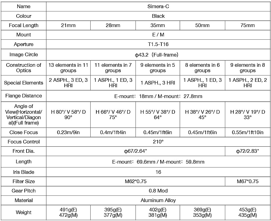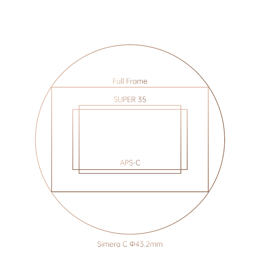 Gracias a su círculo de imagen máximo de 43,2 mm, el Simera-C cubre los sensores de formato completo y es compatible con los formatos Super 35 y APS-C. Está disponible en versiones nativas con montura Sony E y montura Leica M.
