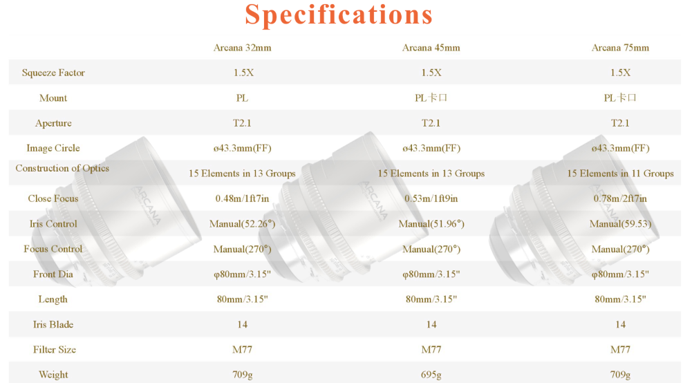 El conjunto de tres objetivos anamórficos fijos DZOFILM Arcana 32/45/75 mm T2.1 Full-frame 1.5X Hybrid (con montura PL) de DZOFILM es un conjunto premium de objetivos anamórficos fijos diseñado para la cinematografía profesional, la producción virtual y la creación cinematográfica de alta calidad. El conjunto incluye tres distancias focales —32 mm, 45 mm y 75 mm—, cada una de ellas diseñada con una apertura constante de T2.1 y cobertura de formato completo con un círculo de imagen de 43,3 mm, lo que garantiza la compatibilidad con una amplia gama de cámaras de cine.