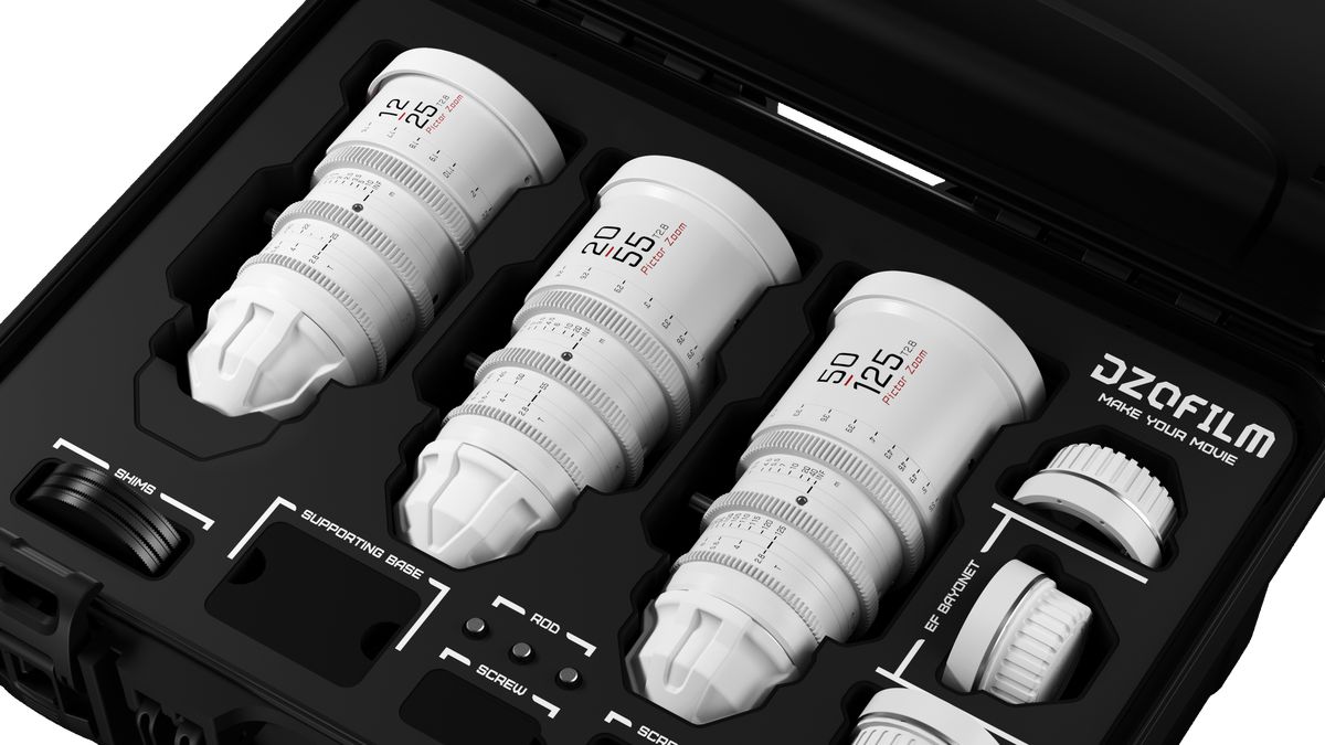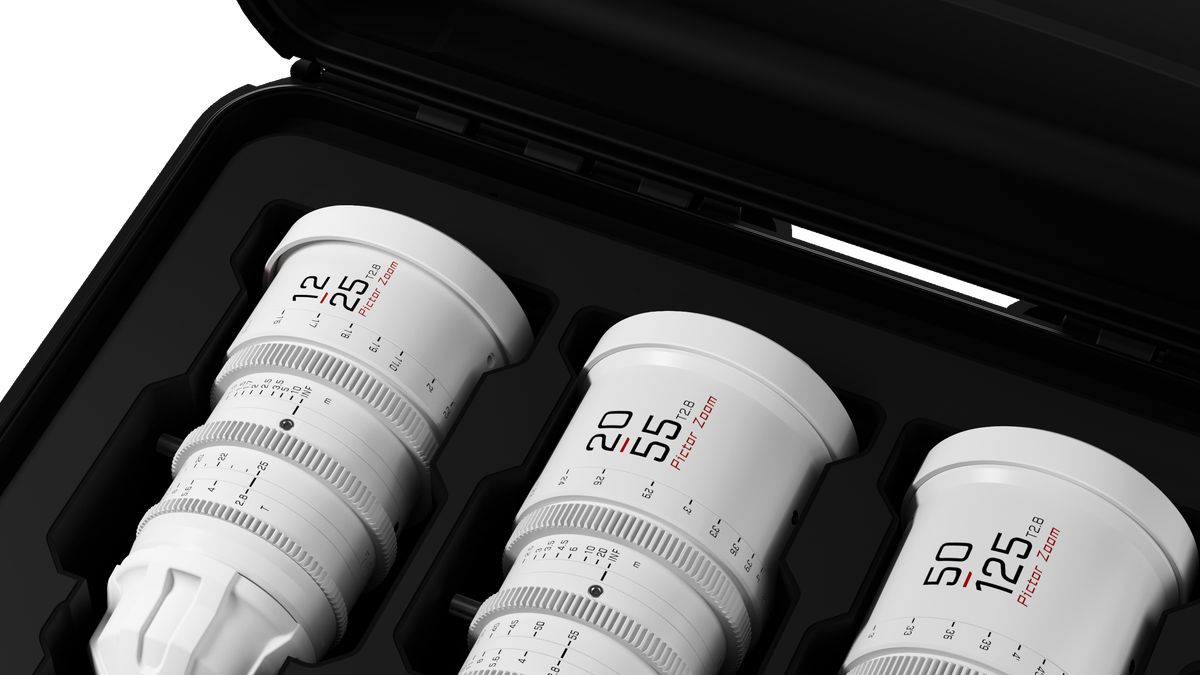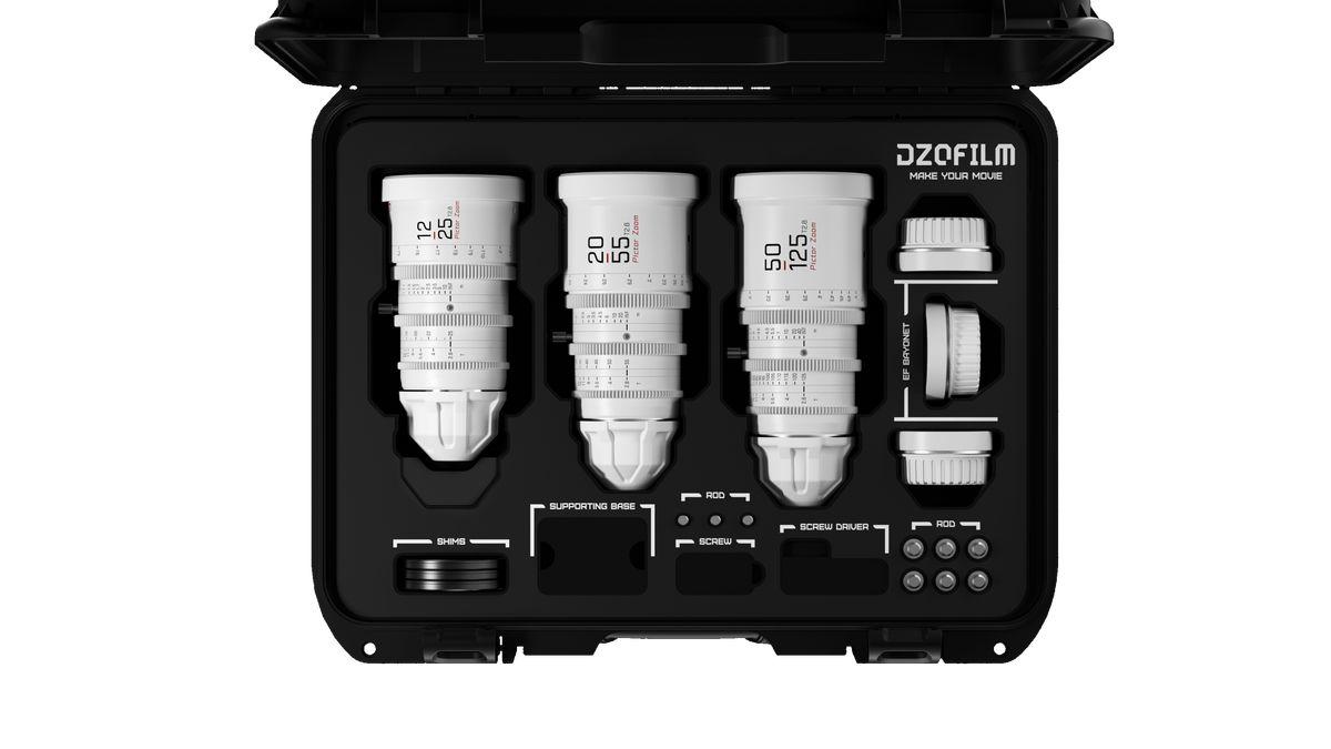 Juego de tres objetivos DZOFilm Pictor Zoom T2,8 – 12-25 mm, 20-55 mm y 50-125 mm – en maletín de transporte. Cada objetivo se suministra de serie con montura PL; también se incluye una montura Canon EF intercambiable para garantizar la compatibilidad con una amplia gama de cámaras de cine digitales.