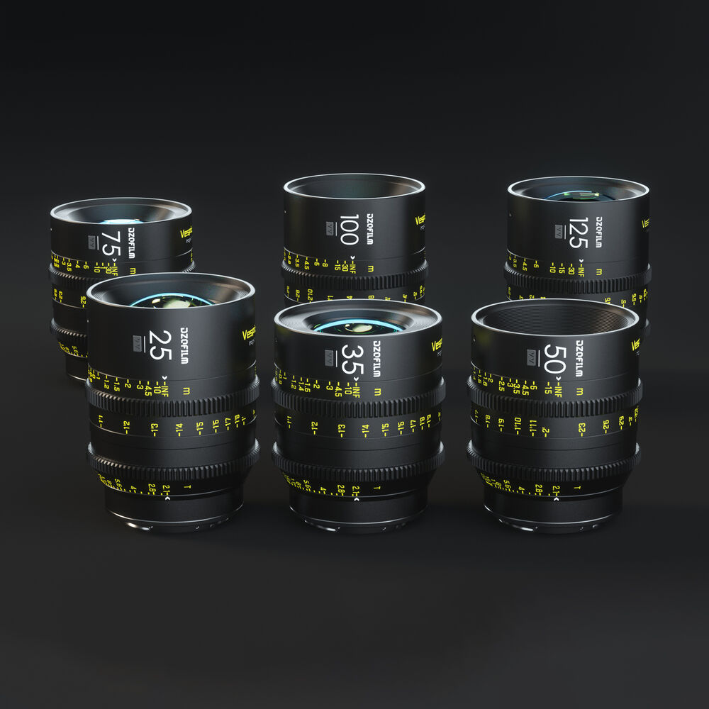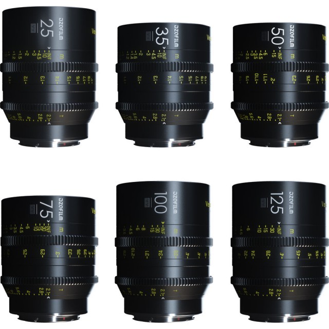El conjunto de 6 objetivos manuales de la serie DZOFilm VESPID con montura EF (intercambiable) incluye modelos con distancias focales de 25, 35, 50, 75, 100 y 125 mm y una luminosidad de T2,1. Los objetivos cubren sensores de hasta tamaño FF (diámetro de imagen de 46,5 mm), pero son ligeros y compactos, incluso para grabaciones manuales, estabilizadores o drones. El diseño de los objetivos está adaptado para la grabación de vídeo: garantiza una «respiración» mínima, se evita la rotación de la parte delantera del objetivo y el cambio de su tamaño al enfocar, y la misma posición de los anillos de enfoque y diafragma asegura un fácil cambio de objetivos en el rig. El kit también incluye un maletín de transporte rígido.