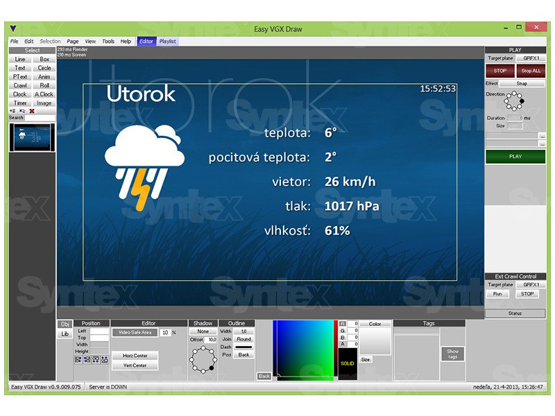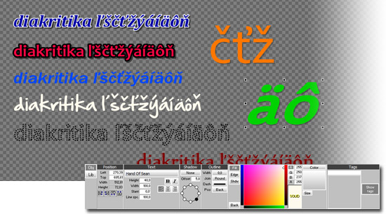 Al crear textos o párrafos completos, es posible utilizar fuentes instaladas directamente en el sistema operativo. Si dispone de fuentes TrueType de Europa del Este con diacríticos, CG las mostrará sin problemas. Puede insertar información de texto en CG directamente en la sección Designer o puede obtenerla de fuentes externas: un archivo de texto, un directorio, XML o RSS. Basta con configurar los parámetros básicos, como la ubicación del texto, la fuente, el tamaño, la alineación, el color, la transparencia y otros parámetros, y la aplicación CG tomará el contenido actual de la fuente.