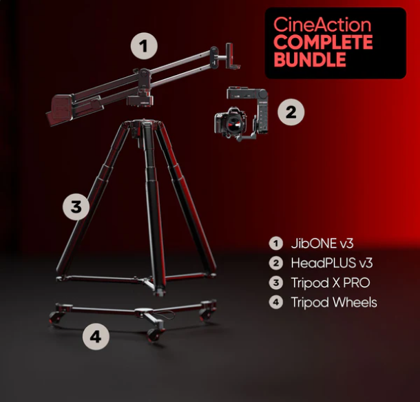 El kit Edelkrone CineAction Bundle - Complete combina el JibONE v3, el cabezal HeadPLUS v3, el trípode X PRO y las ruedas para trípode, y ofrece una solución integral para obtener tomas cinematográficas fluidas de calidad profesional con un control preciso del movimiento.