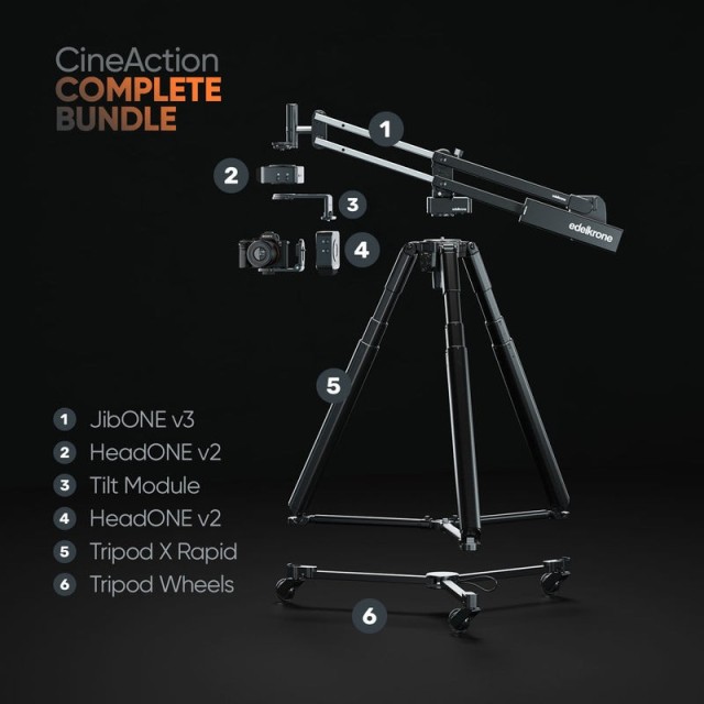 El kit incluye: JibONE v3, HeadONE v2, módulo de inclinación, HeadOne v2, trípode X Rapid, trípode inalámbrico