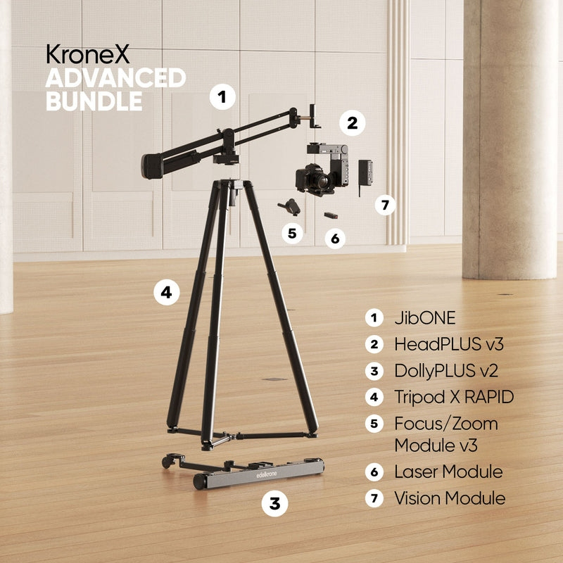 Paquete Edelkrone KroneX - Advanced: Incluye HeadPLUS v3, JibONE v3,DollyPLUS v2,Tripod X RAPID, Focus/Zoom Module v3, Laser Module y Vision Module para movimientos precisos de la cámara y grabaciones dinámicas.