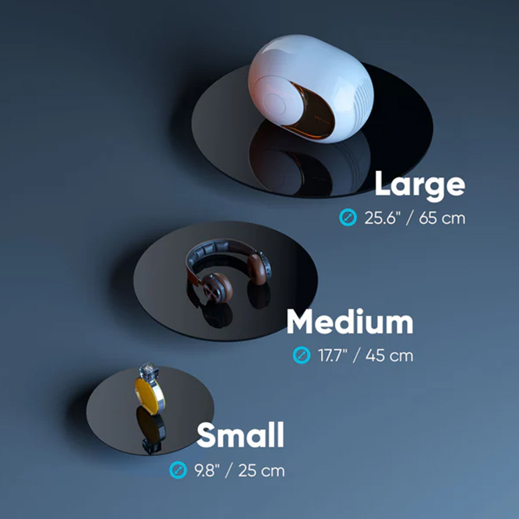 El módulo giratorio está diseñado para girar los productos de forma fluida en 360° y está disponible en tres tamaños para adaptarse a diferentes necesidades. Los modelos mediano y grande están equipados con una base de plexiglás para una mayor estabilidad.