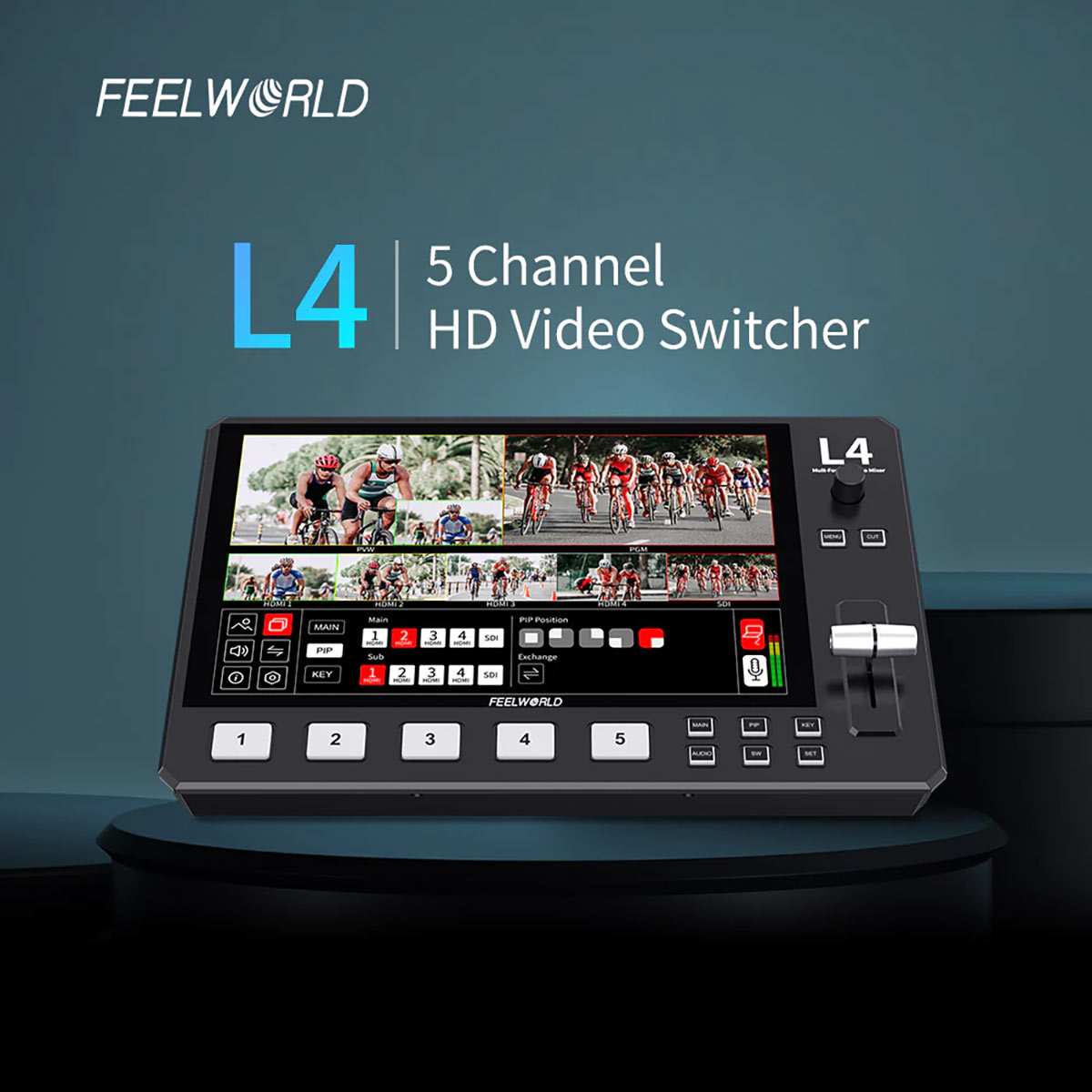 El nuevo éxito de la marca FeelWorld: una unidad de control compacta de cinco canales L4, ofrece una fantástica relación calidad-precio, además de una amplia gama de funciones y una excelente ergonomía. El fabricante ha aprovechado su experiencia en la fabricación de las populares consolas L1 Plus y L2 Plus, y nos ofrece un dispositivo muy bien equipado, pero a la vez muy compacto. FeelWorld L4 en resumen: 1 entrada de vídeo SDI y 4 entradas HDMI, pantalla LCD táctil integrada de 10,1" con visualización multiview (5 entradas, vistas previas PGM y PST), salidas de programa/vista previa (HDMI y SDI), streaming por USB 3.0 con una resolución de hasta 1080p60, cómodos controles en forma de botones LED y T-Bar, funciones de croma y efectos (incluido PiP), entrada/salida de audio TRS de 3,5 mm y carcasa metálica resistente (29,02 x 18,95 x 5,57 cm, 1,48 kg). La entrada SDI admite una resolución de hasta 1080p60, mientras que la HDMI admite un máximo de UHD a 30 fps; tampoco faltan la interfaz RJ-45/LAN y la refrigeración activa (con activación/desactivación automática) para un funcionamiento de máxima fiabilidad.